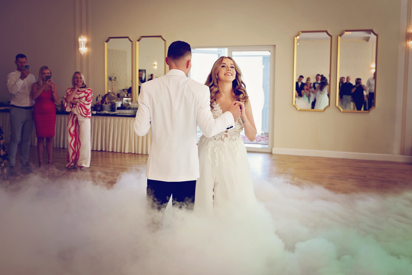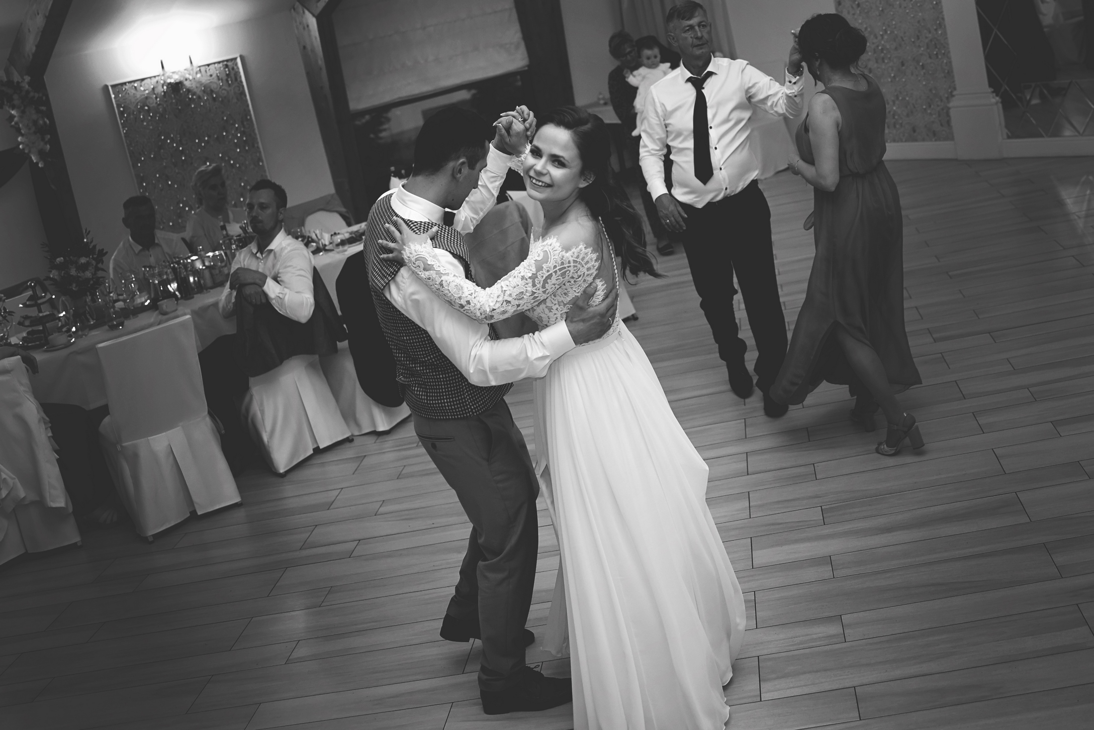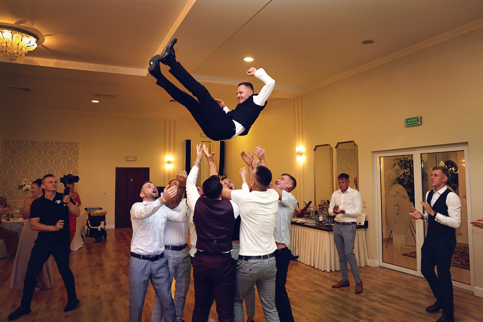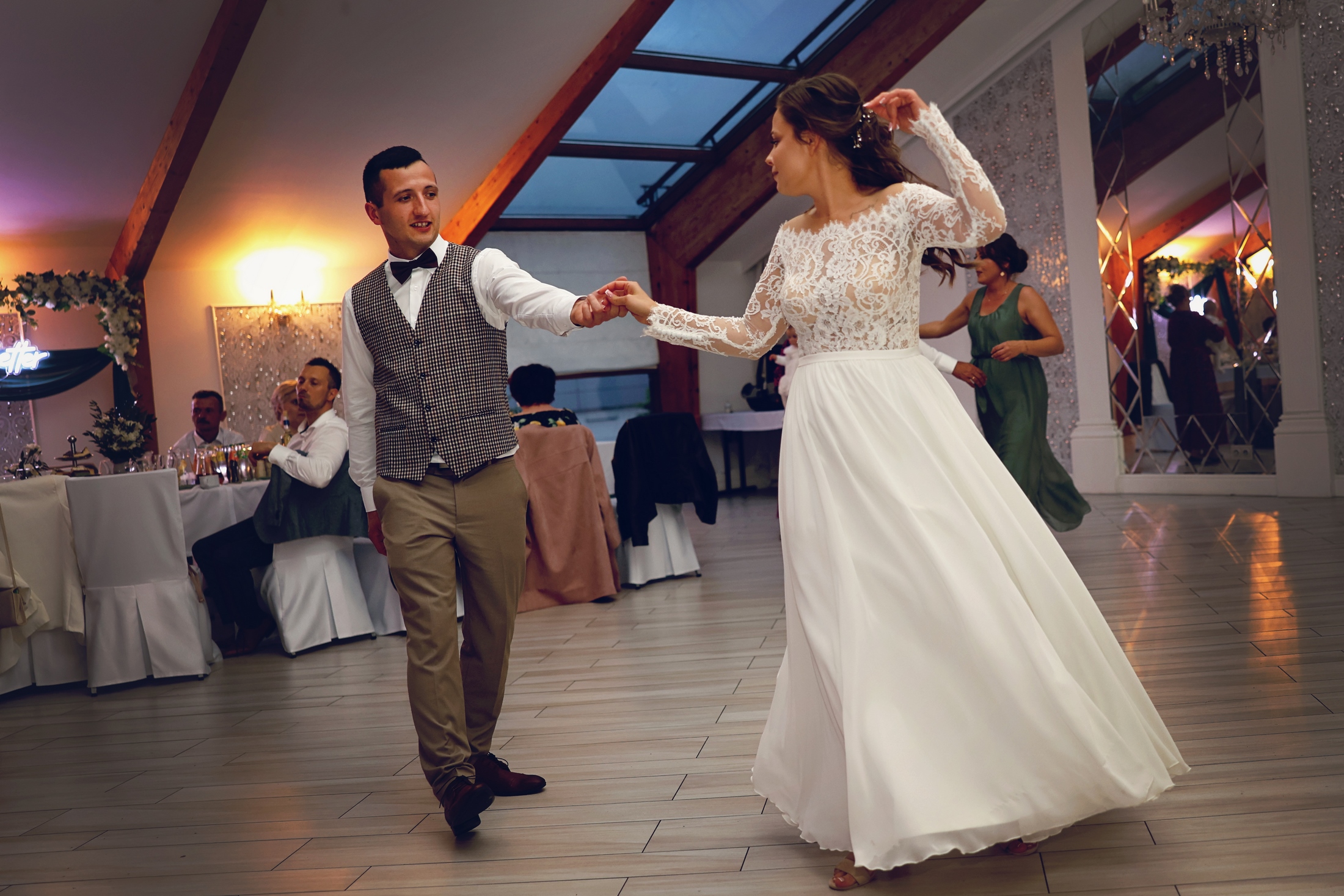- Początek przyjęcia: Goście zazwyczaj witani są przez parę młodą tuż po ceremonii. Para młoda może np. powitać ich przy wejściu na salę lub w specjalnie przygotowanej strefie powitalnej.